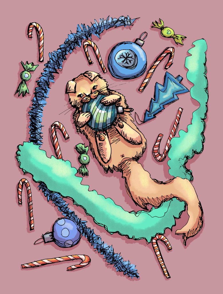 Naughty kitten found Christmas decorations and made mess.