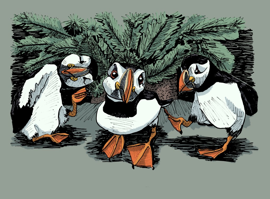 Puffins are wondering where their Christmas presents are. Hopefully, Santa brings them fish.